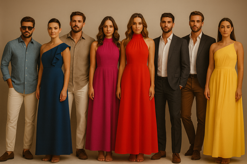 Para harmonizar com o clima praiano, sugerimos aos cavalheiros o uso de camisa de botão com calças de sarja ou alfaiataria, evitando polos, bermudas e jeans. Às damas, recomendamos vestidos longos, em tecidos lisos e formais, que trazem elegância e conforto mesmo com a brisa do mar;